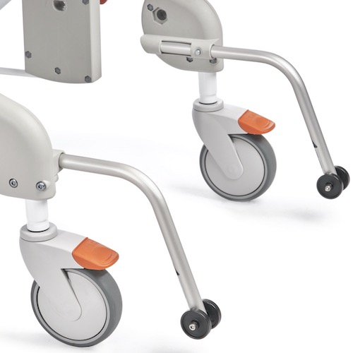 – En üst kalitede üretilmiş rulmanlı 4 adet tekerleğe sahiptir. Her tekerleğin üzerinde ayak freni bulunur. Hasta üzerindeyken banyo tuvalet sandalyesi kolayca hareket ettirilebilir.